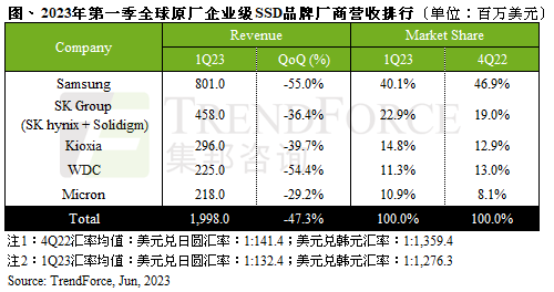 三星(Samsung)自2022年第四季起便以价格战扩大市占率,但2023年客户的服务器出货目标大幅修正,导致第一季Enterprise SSD订单需求萎缩,又以北美地区需求下修的最明显,第一季Enterprise SSD营收为8.01亿美元,环比下跌55.0%。因北美客户仍在持续调整库存,第二季营收可能持续下滑,预期下半年才有机会回升。