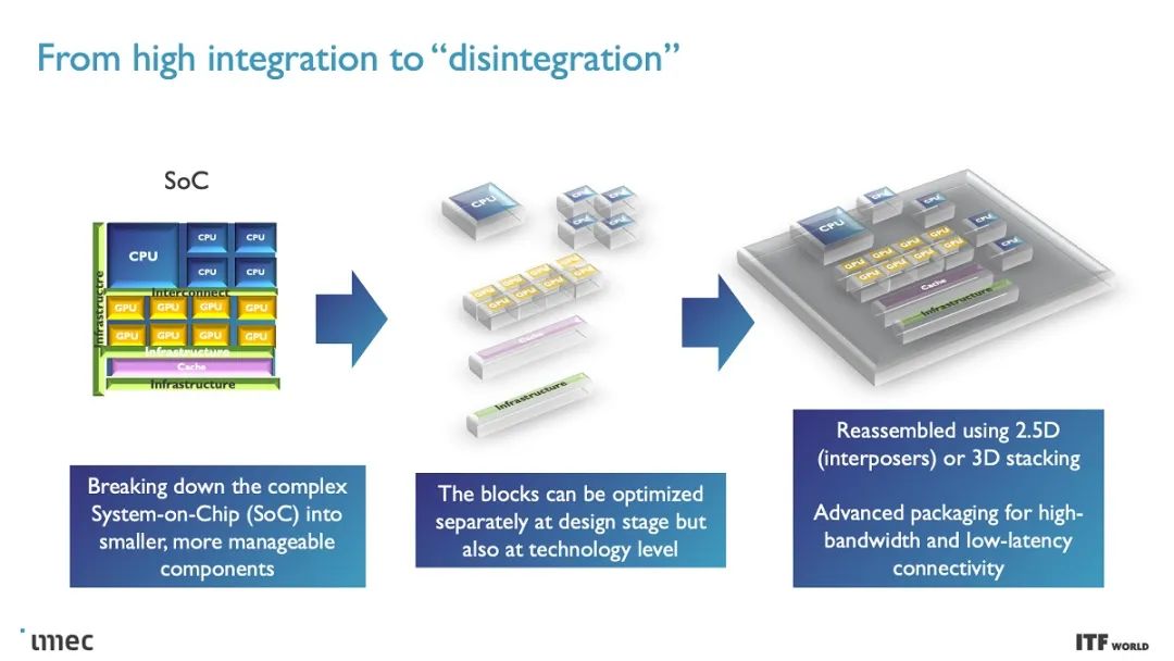 随着时间发展,转移到更小的制程节点会越来越贵,原有的单芯片设计方案让位给小芯片(Chiplet)设计。IMEC的制程发展愿景,包括芯片分解至更小,将缓存和存储器分成不同的晶体管单元,然后以3D排列堆叠至其他芯片功能上。这方法严重依赖后端供电网络(BPDN),将所有供电改到晶体管背面。