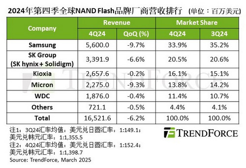 Micron(美光)在Enterprise SSD出货表现亮眼,但仍不敌消费需求低迷,2024年第四季NAND Flash营收季减9.3%,为22.8亿美元,排名第四。2025年Micron将减少NAND Flash资本投资,放缓技术升级,并着重60TB以上产品需求,以改善盈利。
